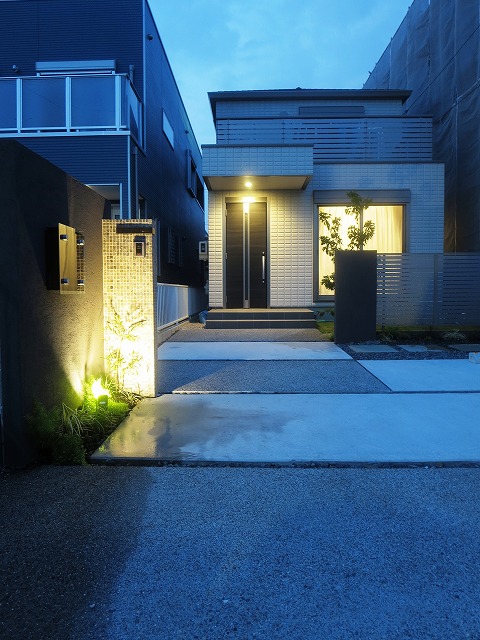 控え壁にモザイクタイルをあしらうことで、構造体を活かした門廻りが