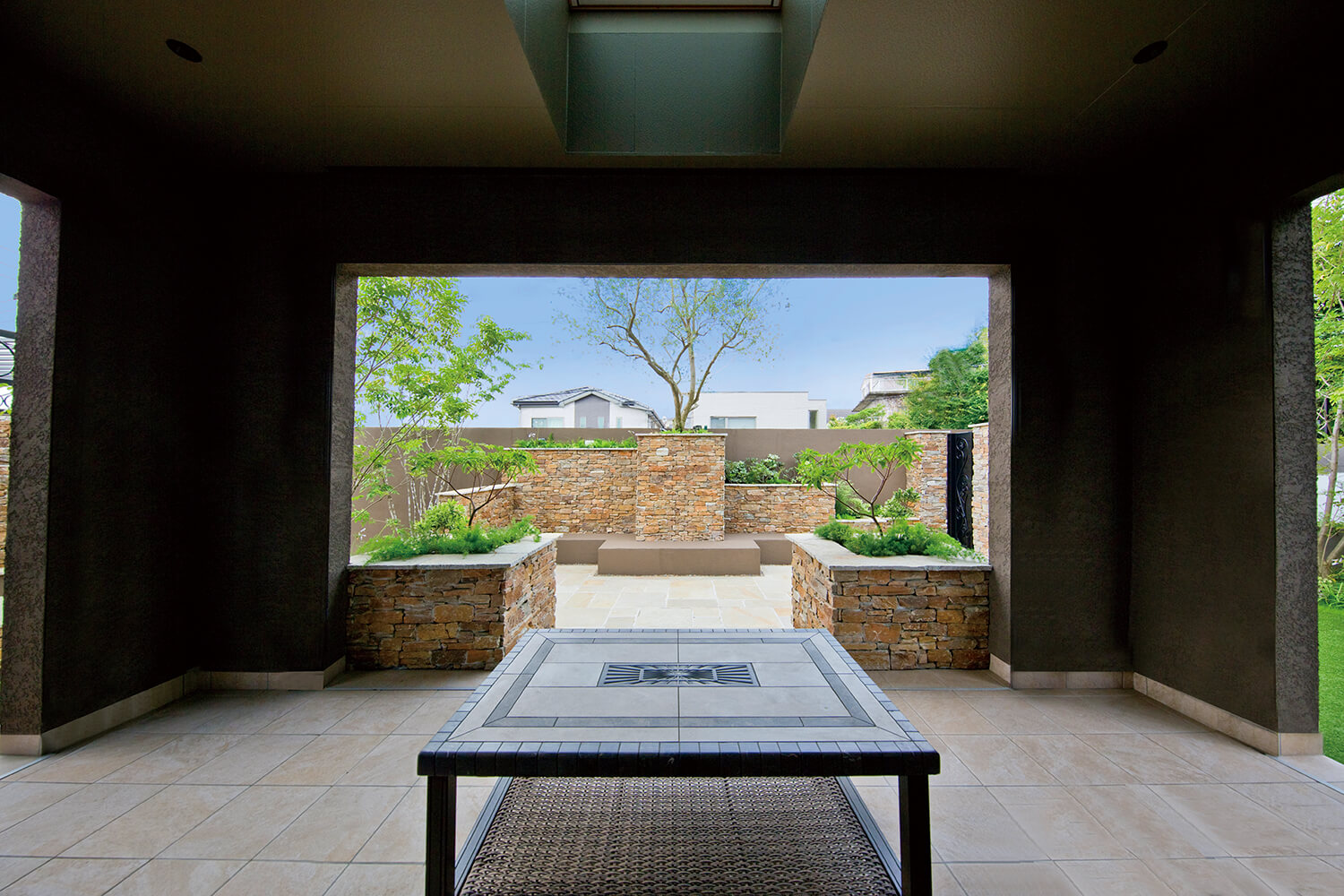 庭のどこからでも変化に富み美しい眺めとなるよう、構造物や植物の配置やプロポーションに気を配り、庭に出ることを楽しんでいただけるように居場所をデザインしました。庭を囲む塀は市の規制で外側のフェンスを撤去できないため、内側の型枠CB壁に石材や左官仕上げを施して人工的な質感をなくし、ナチュラルで陽光の映える空間作りを心掛けました。