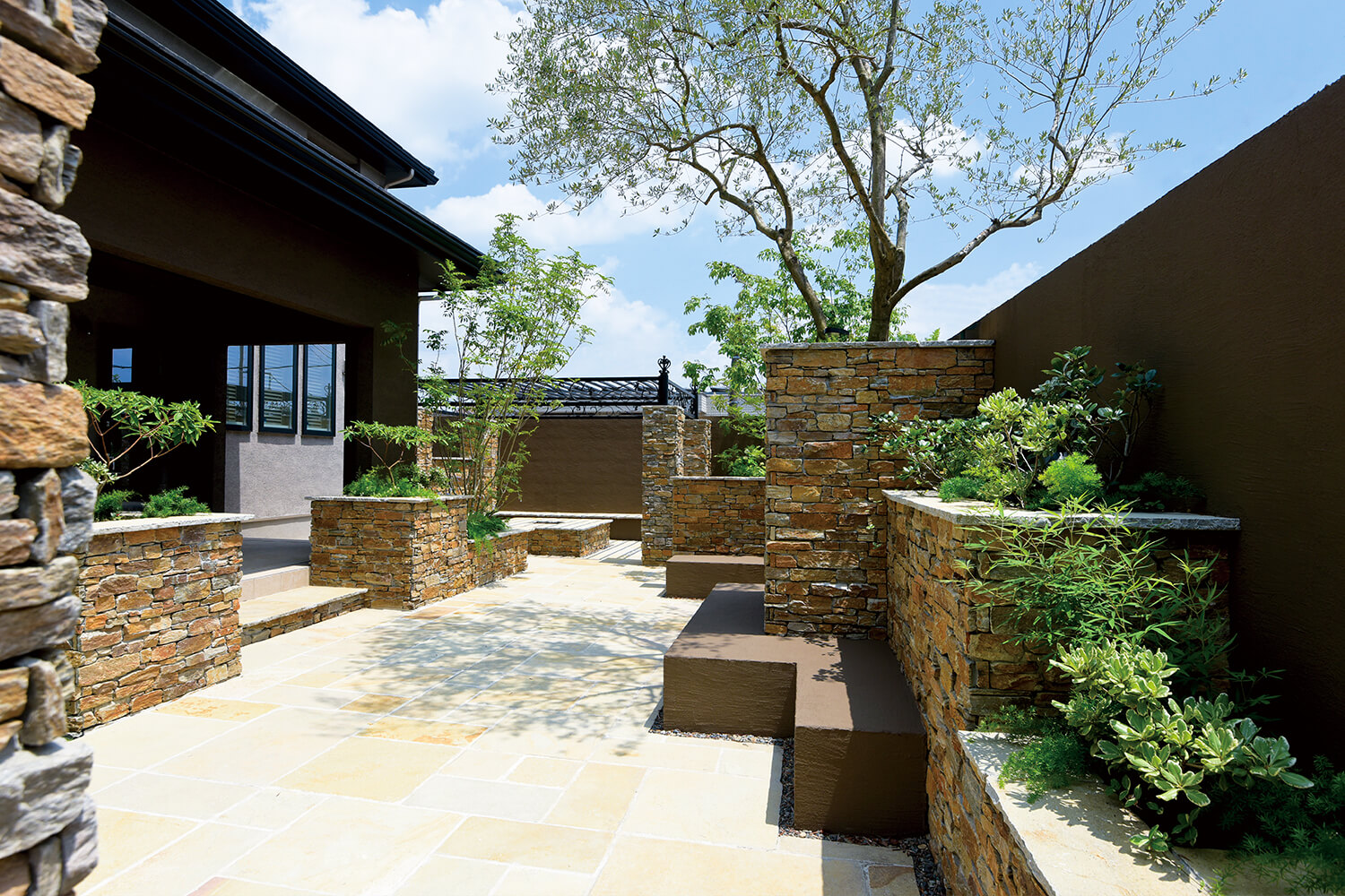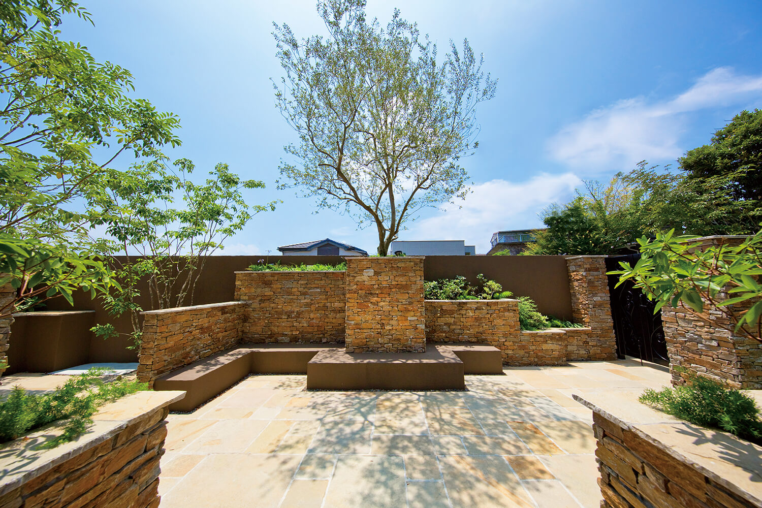 壁の高さを段階的に変化させることで、閉塞感を与えずに適度な囲われ感のある空間に。シンメトリーとアシンメトリーで構成された花壇のバランスも絶妙