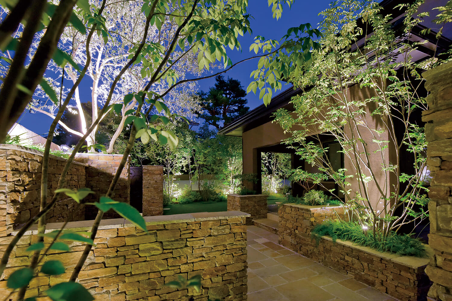 夜には植え込みの各所に設置されたライトが木々を美しく浮かび上がらせる。多くの光源が庭全体に配置されているので、夜間のガーデンパーティーやBBQも楽しめる